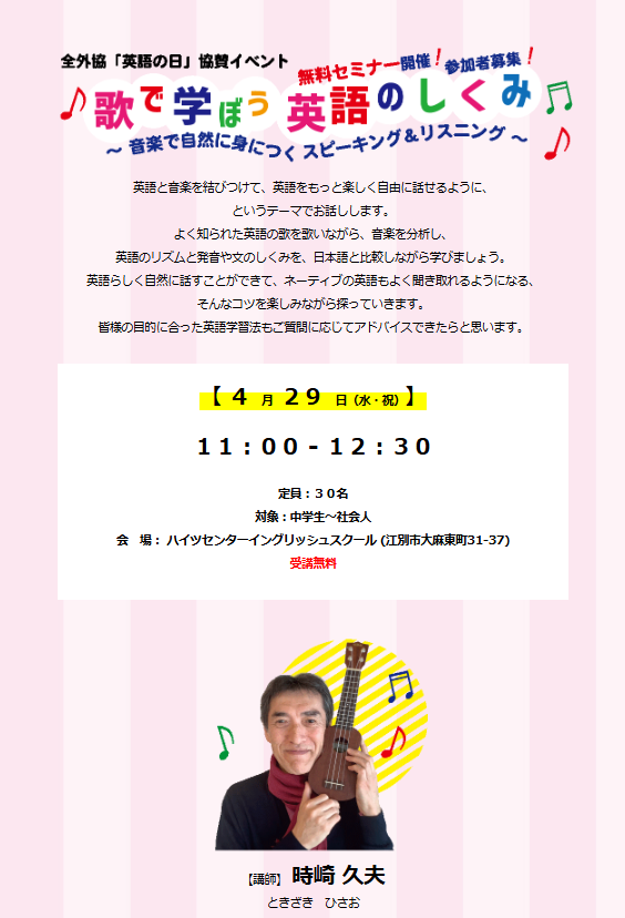 英語の日共催イベント「歌で学ぼう英語のしくみ」〜音楽で自然に身につくスピーキング&リスニング〜 4/29(祝)